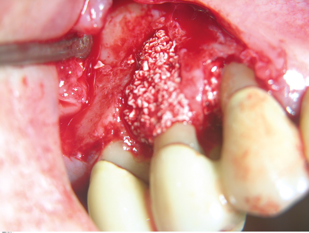 05/10 - Grafting of the bone defect with a mixture of cerabone® and autologous bone chips.GTR for the treatment of a deep three-dimensional intrabony defect using cerabone®, collprotect® membrane and Straumann® Emdogain® - Dr. T. Schwaar