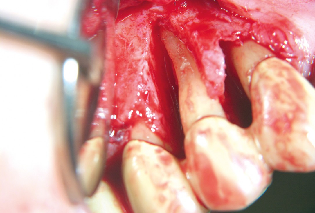 Pre-surgical probing reveals a deep intrabony defect on the distal aspect of the upper canine.