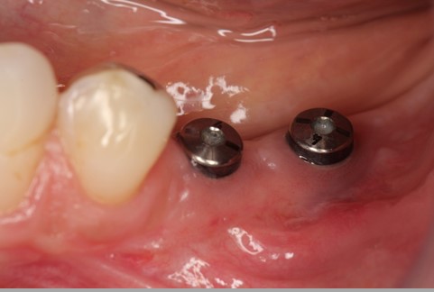 1/5 - Initial clinical situation with loss of attached gingiva around the implants and shallow vestibule