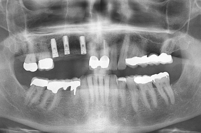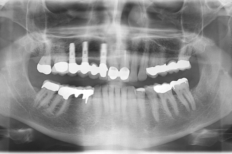 Initial x-ray showing bone loss around implants placed 5 years ago in another dental clinic