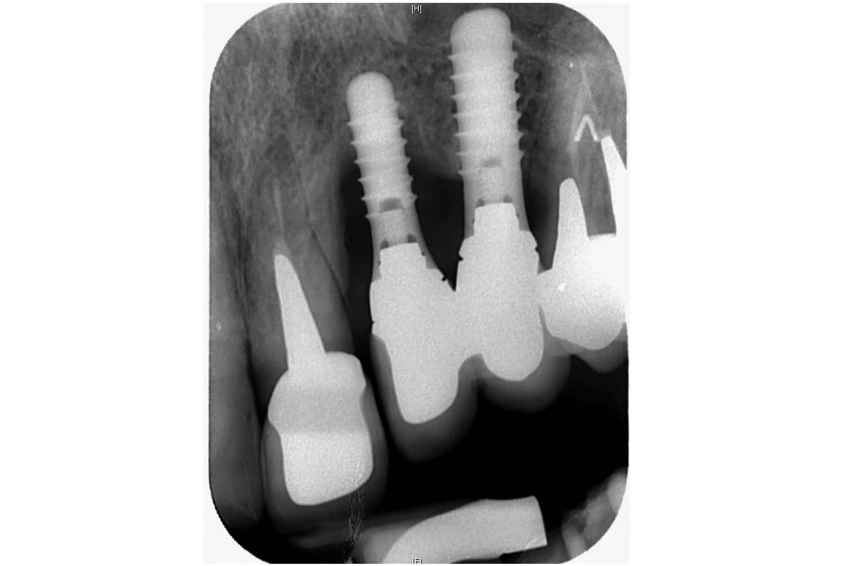 Initial x-ray showing bone loss around implants placed 5 years ago in another dental clinic