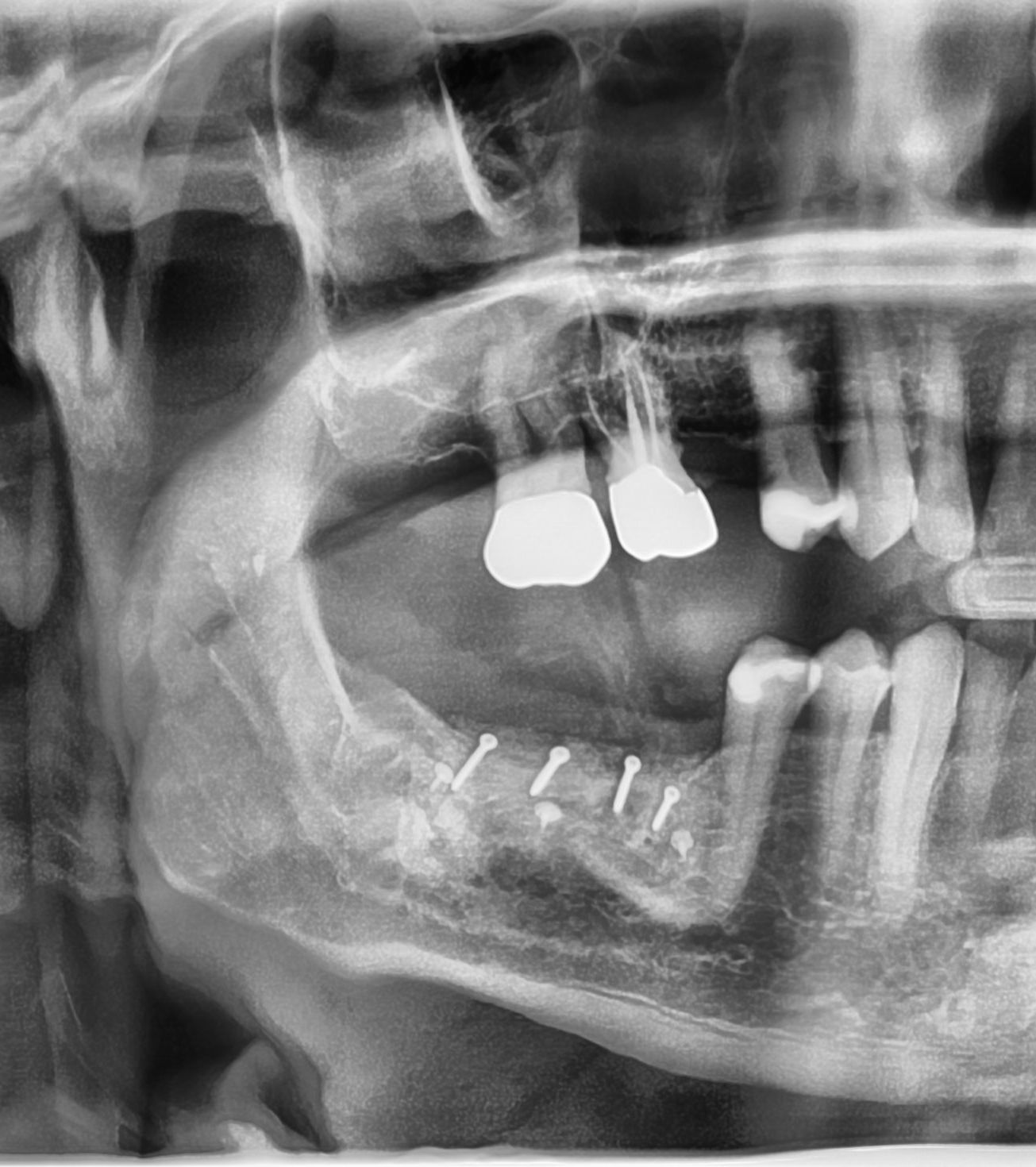 21/28 - X-ray scan of the augmented ridge after implantationThree-dimensional augmentation with maxgraft® cortico - Dr. R. Würdinger
