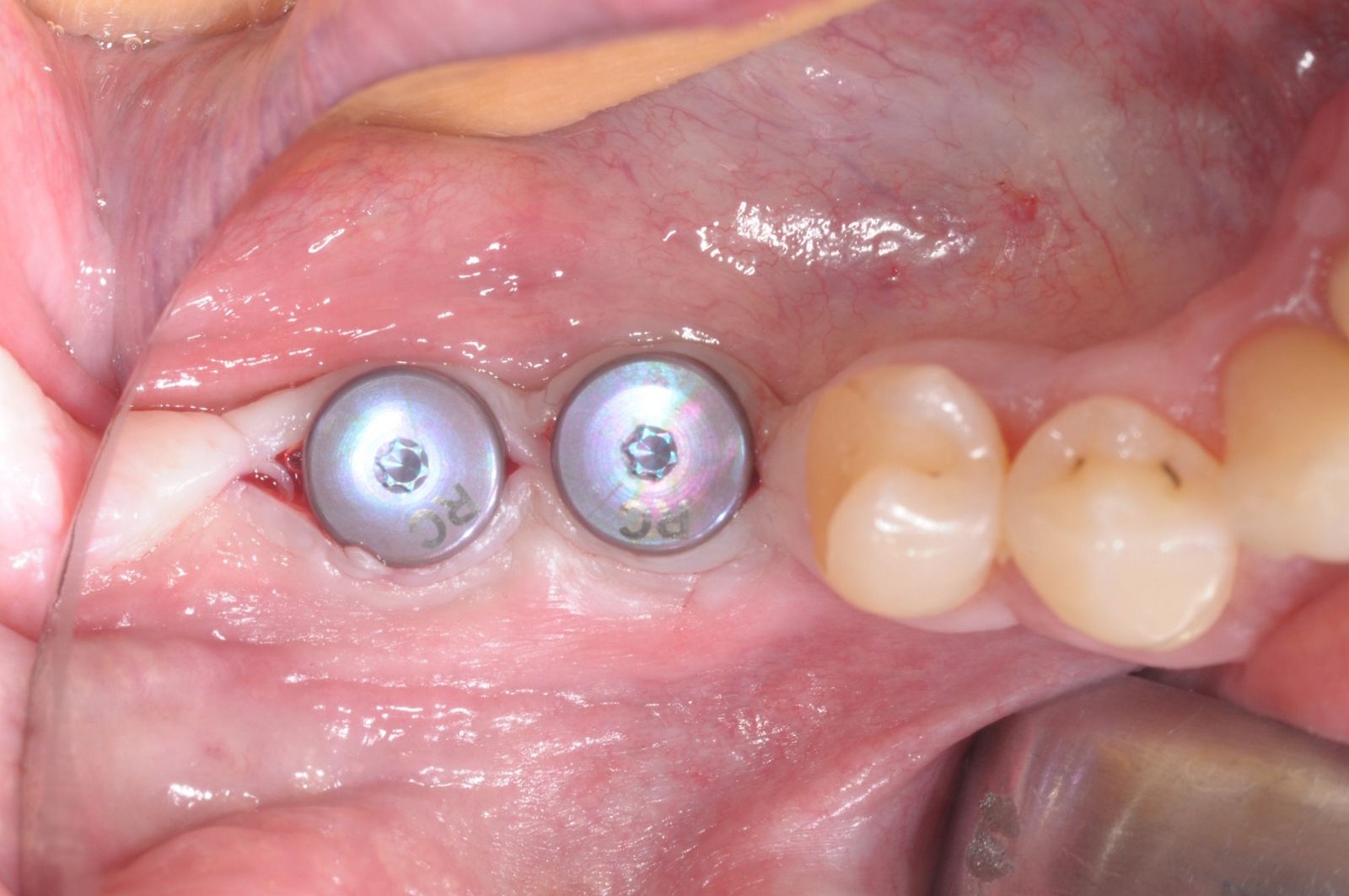 23/28 - Stab incision for reopening of the surgical site and installation of gingival formers - occlusal viewThree-dimensional augmentation with maxgraft® cortico - Dr. R. Würdinger