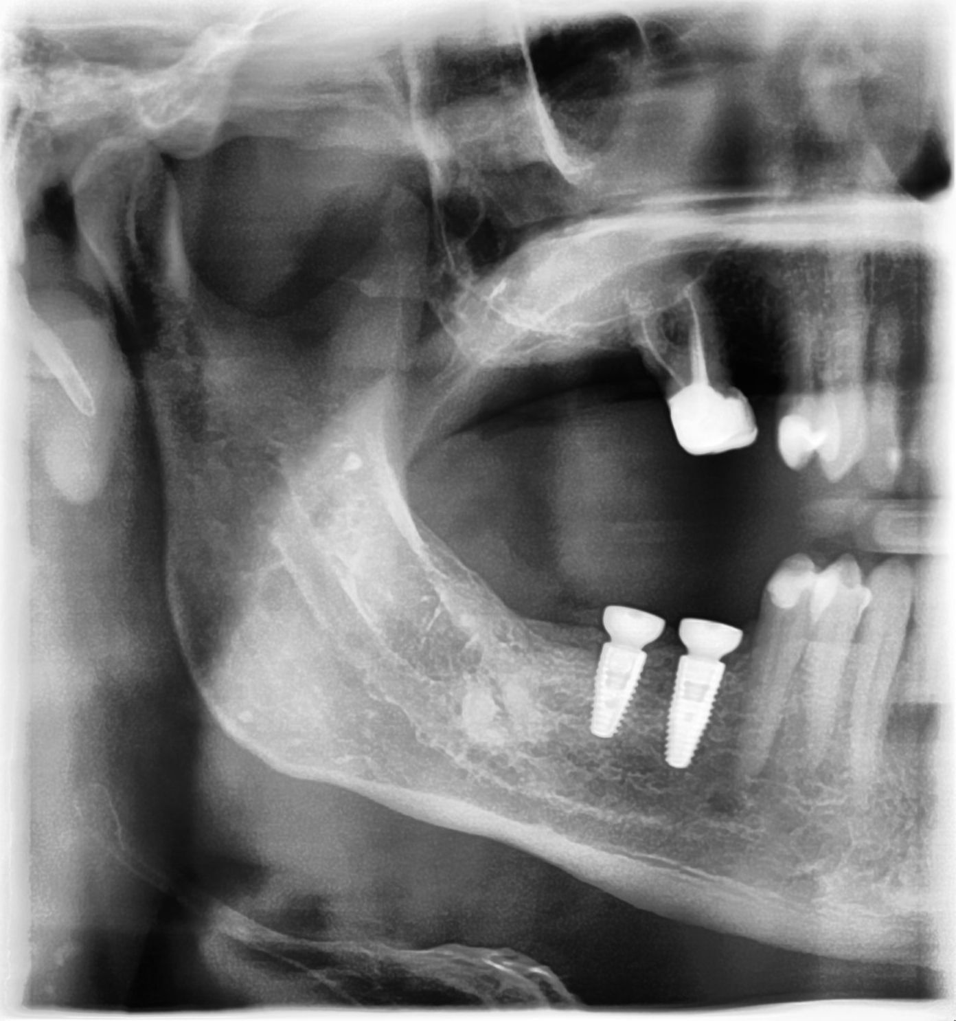 28/28 - Radiographic control of the final prosthesis - excellent stability of the augmented bone tissueThree-dimensional augmentation with maxgraft® cortico - Dr. R. Würdinger