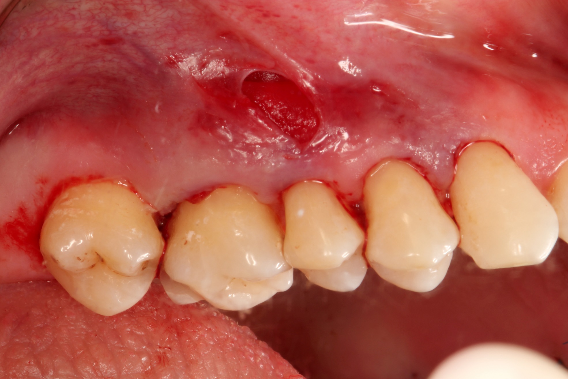 03/09 - mucoderm® inserted into the previously prepared tunnel in the first quadrant. Inseration of the collagen matrix via an additionel vestibular incision.