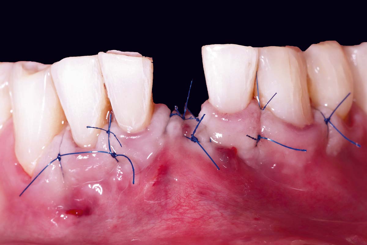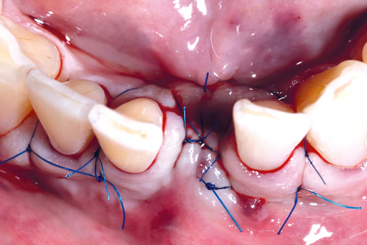 Immediately placed implant covered with permamem®. permamem® passively immobilized by sutures and intentionally left exposed to the oral cavity.
