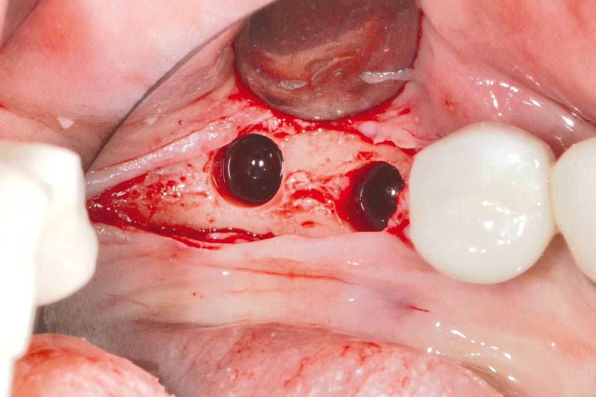 Bone defect in area 11-21 due to two lost implants (periimplantitis) after 15 years of function