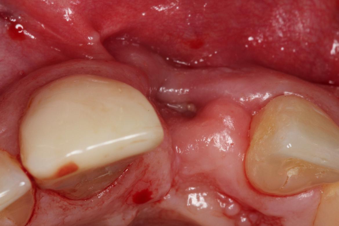 Longitudinal fracture on the root resected tooth 21 with visible buccal fistula